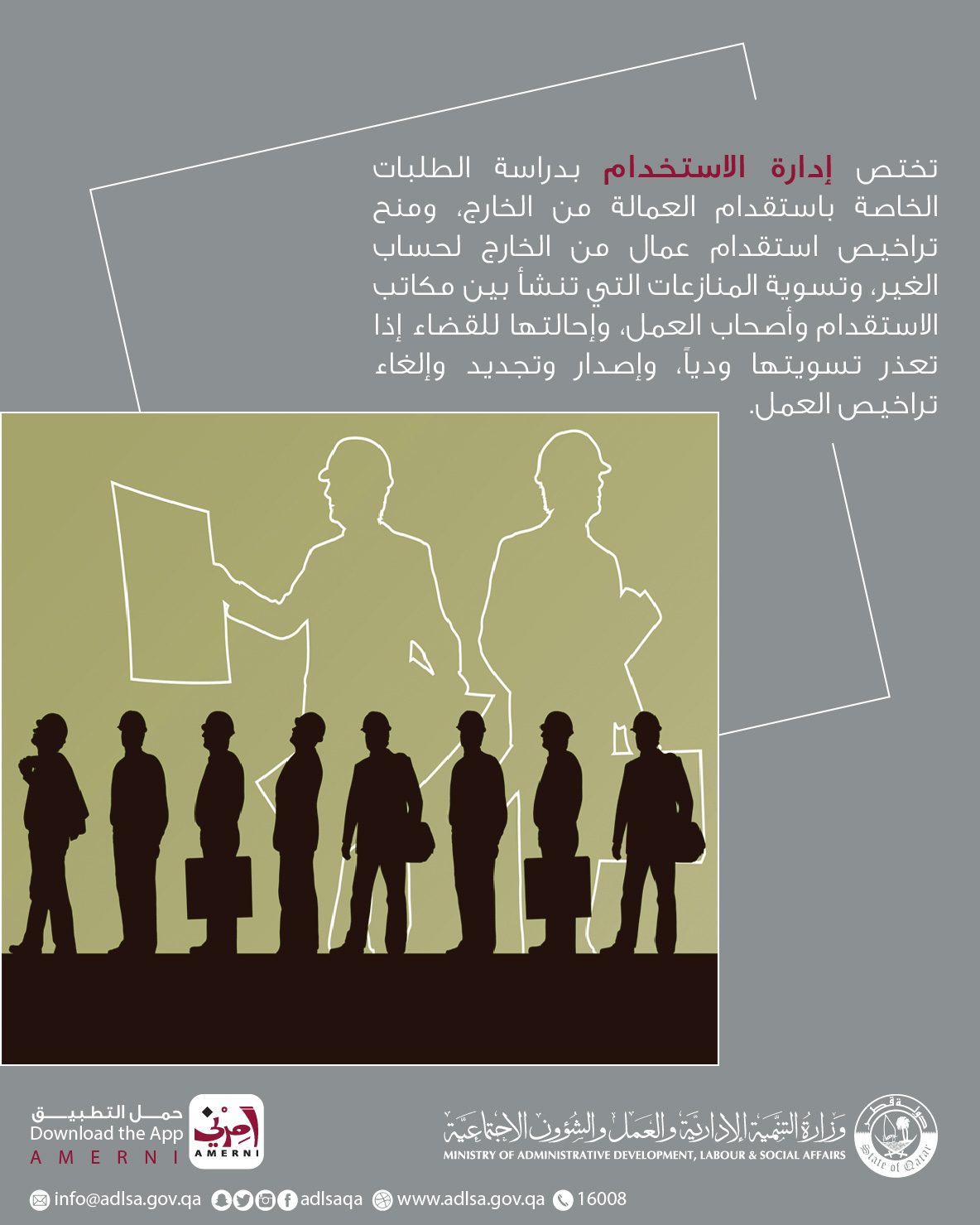 وزارة التنمية والعمل Auf Twitter تختص إدارة الاستخدام بدراسة الطلبات الخاصة باستقدام العمالة من الخارج ومنح تراخيص استقدام عمال من الخارج لحساب الغير وتسوية المنازعات التي تنشأ بين مكاتب الاستقدام وأصحاب العمل وإحالتها