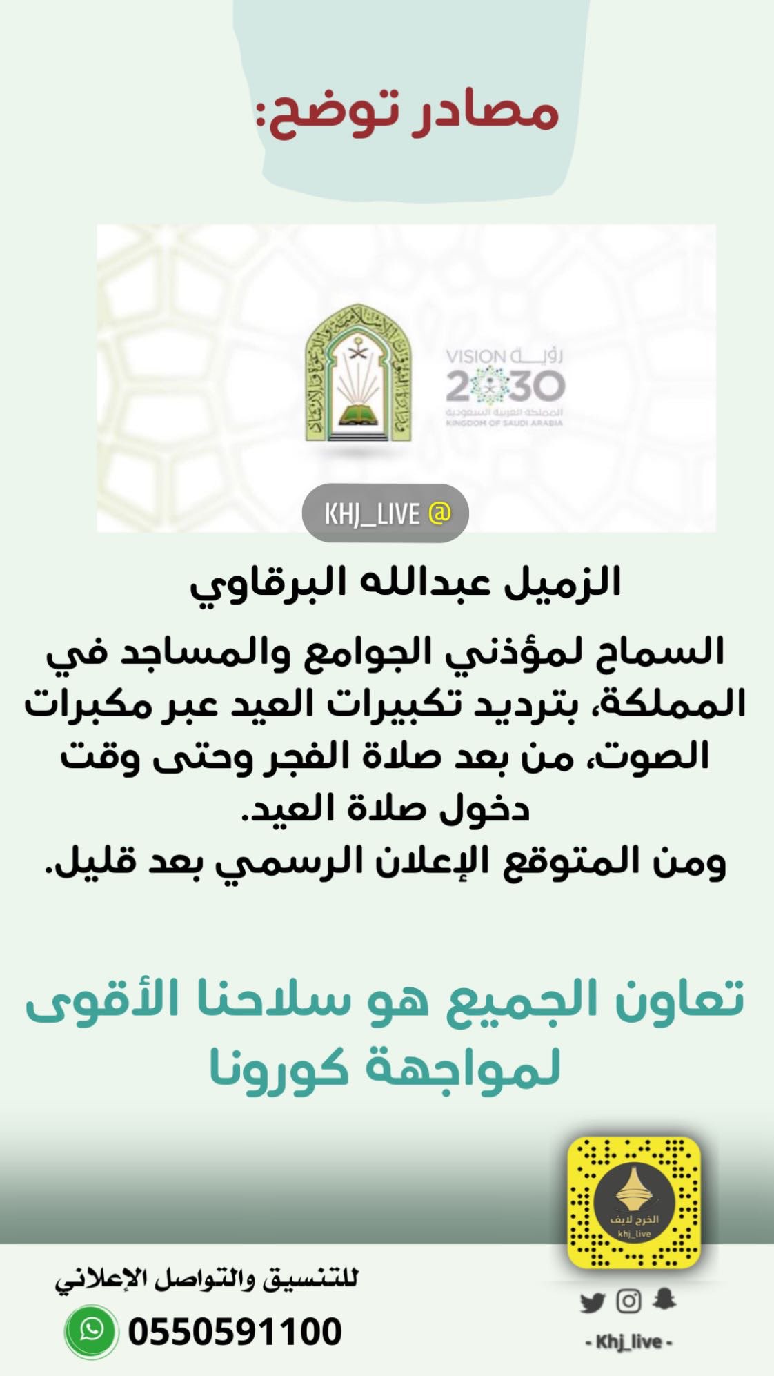 الخرج لايف A Twitter عاجل السماح لمؤذني الجوامع والمساجد في السعودية بترديد تكبيرات العيد عبر مكبرات الصوت من بعد الفجر وحتى وقت دخول صلاة الخرج سناب الخرج لايف Https T Co Dqtpmnjuva