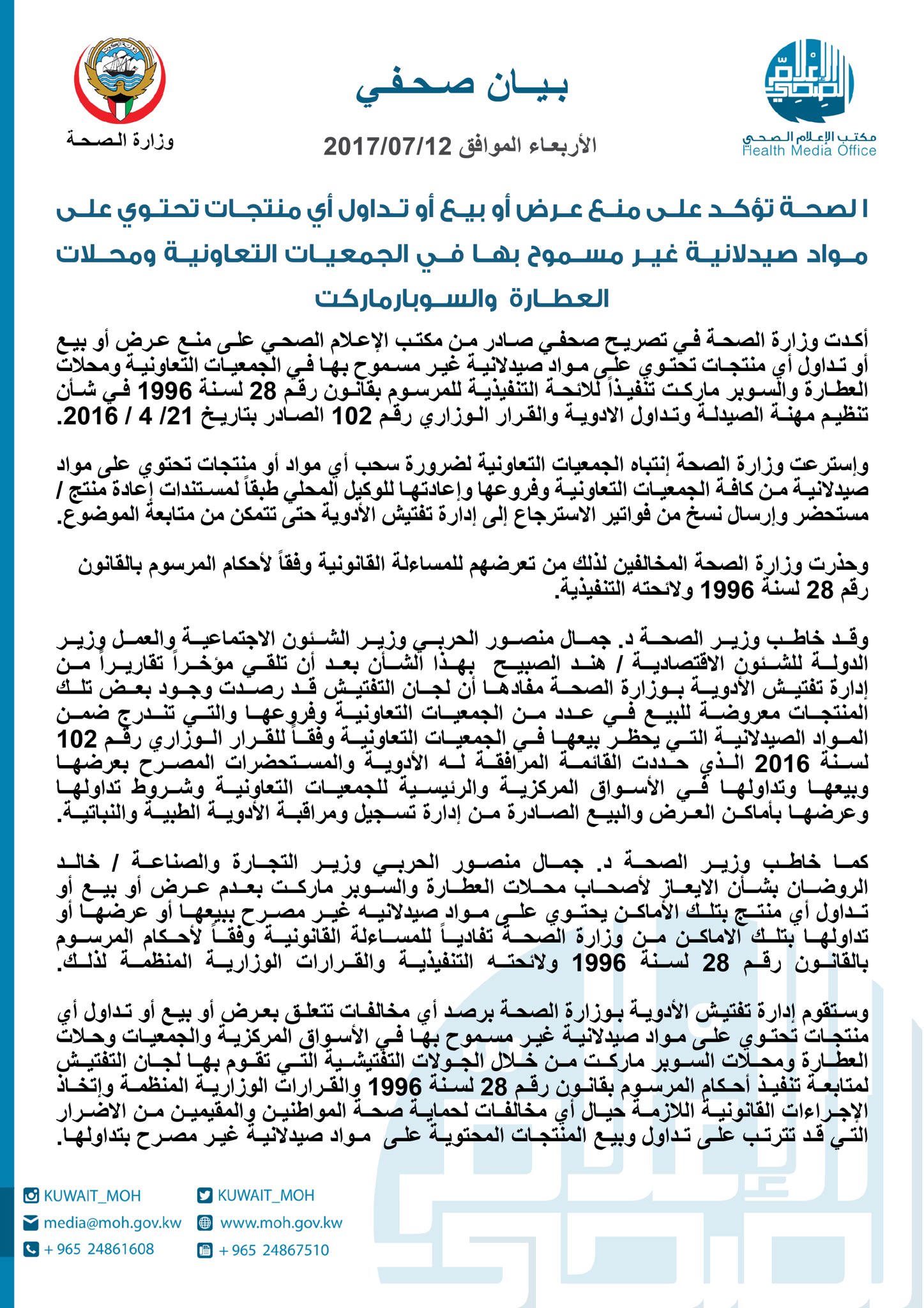 وزارة الصحة الكويت En Twitter الصحة تؤكد على منع عرض أو بيع أو تداول أي منتجات تحتوي على مواد صيدلانية غير مسموح بها في الجمعيات التعاونية ومحلات العطارة والسوبارماركت Https T Co Q7sqe3zeiy
