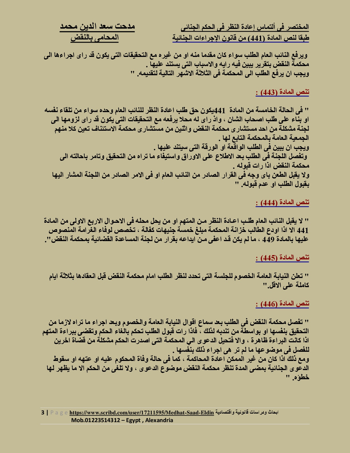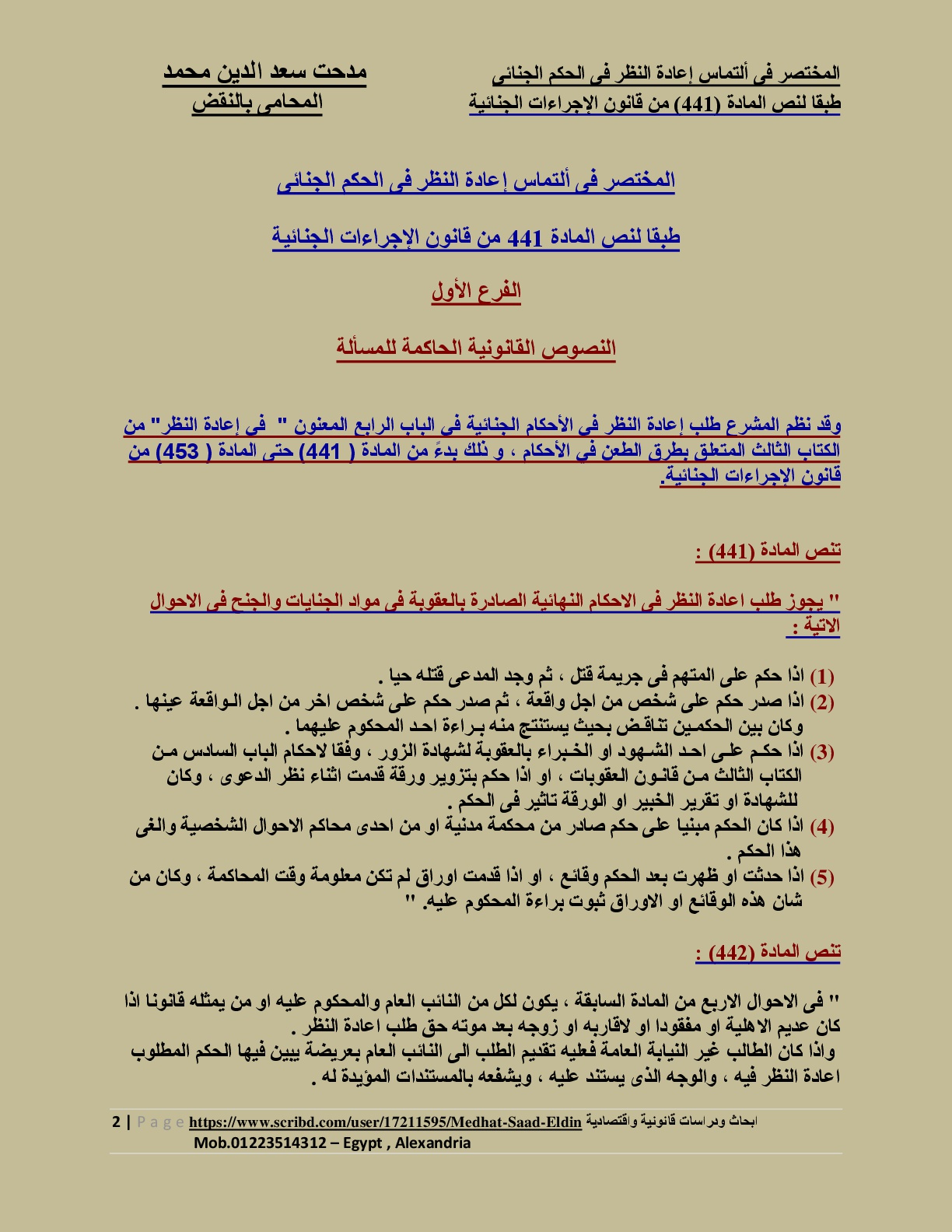 مدحت سعد الدين محمد المحامى بالنقض المختصر فى ألتماس إعادة النظر فى الحكم الجنائى طبقا لنص المادة 441 من قانون الإجراءات الجنائية