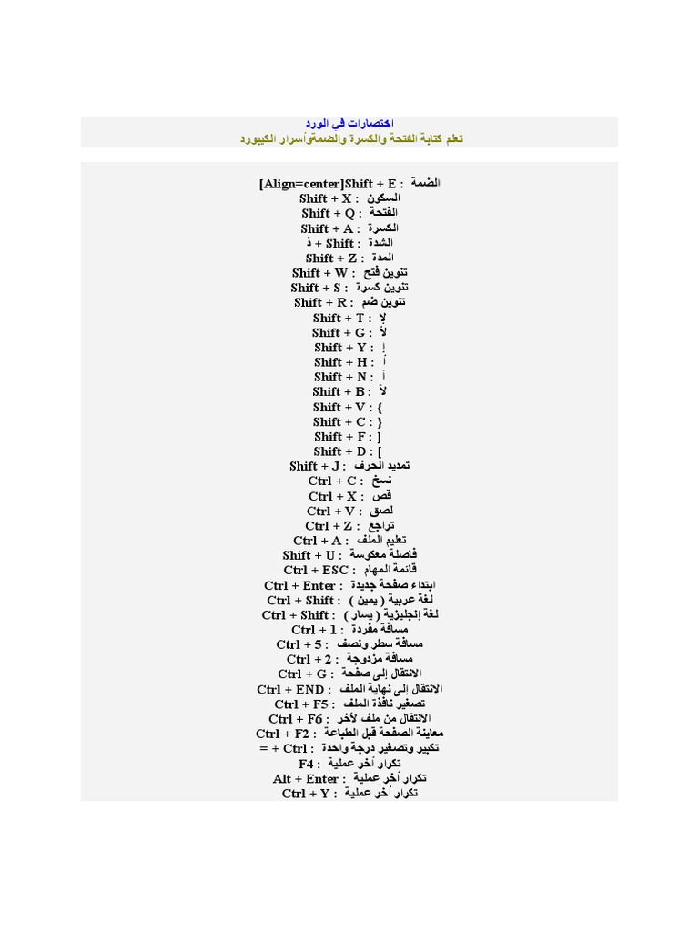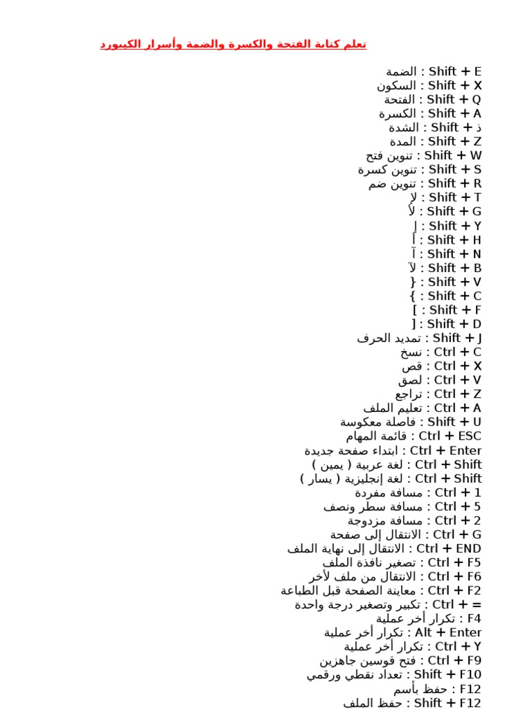كل اختصارات الكيبورد لوحة المفاتيح وكتابة الحركات بالعربي وتشكيل الكلمات في خمس ورقات فقط