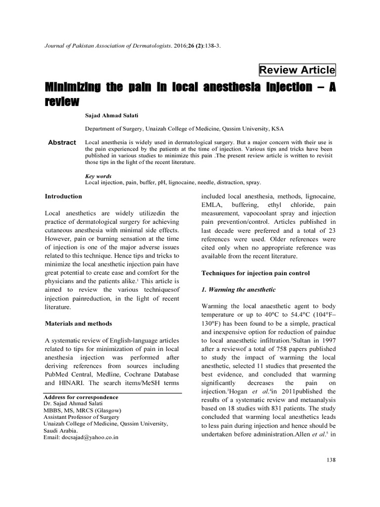 Minimizing The Pain In Local Anesthesia Injection A Review Anesthesia Injection Medicine